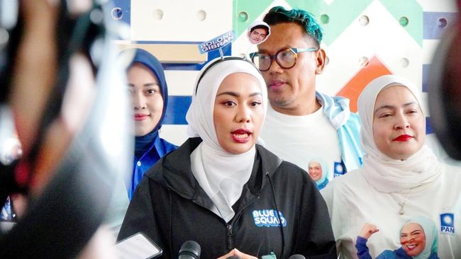 Ketua DPP Partai Amanat Nasional (PAN), Zita Anjani, datang mengenakan aksesori bando bertuliskan Bolone Gibran, beserta foto wajah calon wakil presiden (cawapres) nomor urut dua tersebut, saat mendampingi tiga kader PAN, yakni Uya Kuya, Eko Patrio, dan Pasha Ungu, ke Kantor Bawaslu, Kamis (21/12).