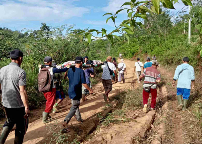 Jalan rusak di Desa Langgar Jaya, Kecamatan Bermani Ilir, Kepahiang, Bengkulu tak kunjung diperbaiki. Warga yang sakit harus digotong ramai