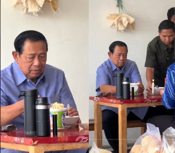 Momen Susilo Bambang Yudhoyono (SBY) tengah makan Pop Mie di warung sederhana menarik perhatian. Momennya ini dibagikan oleh sang putra, Agus Yudhoyono di TikTok.
