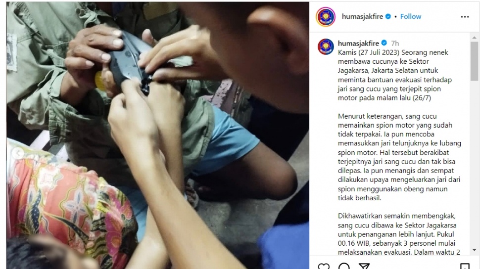 Pemadam Kebakaran DKI turun tangan membantu anak kecil yang jarinya terjepit di lubang spion motor. Kejadian unik itu bermula pada Rabu malam (26/7) di Jagakarsa, Jakarta Selatan.
